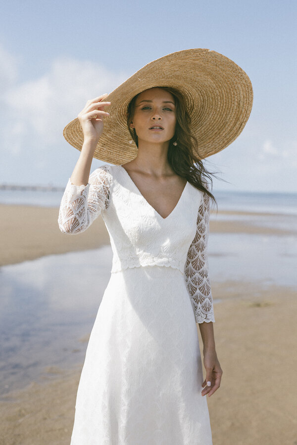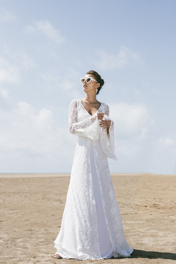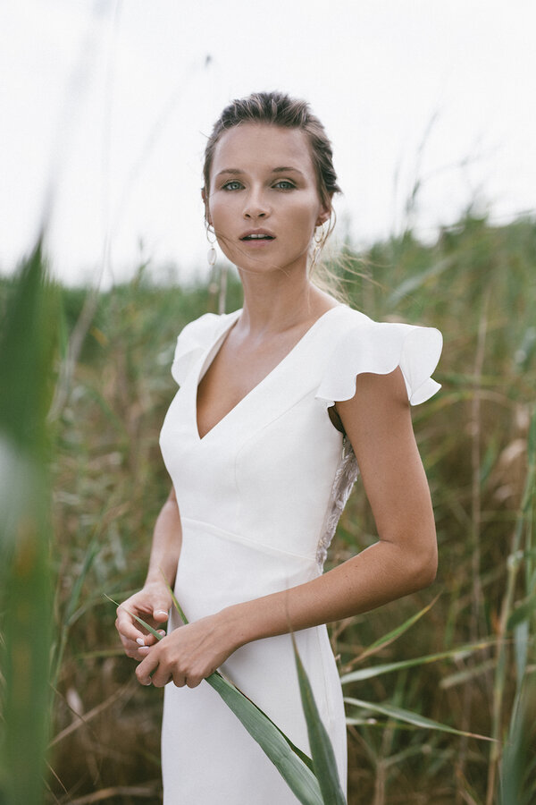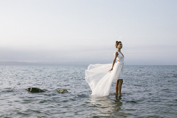 Como el sol acariciando las aguas del mar al atardecer,La Mer est Calmees fuerza y delicadeza a la vez. Una colección diseñada para una novia segura de si misma y sin desconfianza; una mujer que nada sin miedo de alejarse de la orilla, queriendo llevar su amor al horizonte.