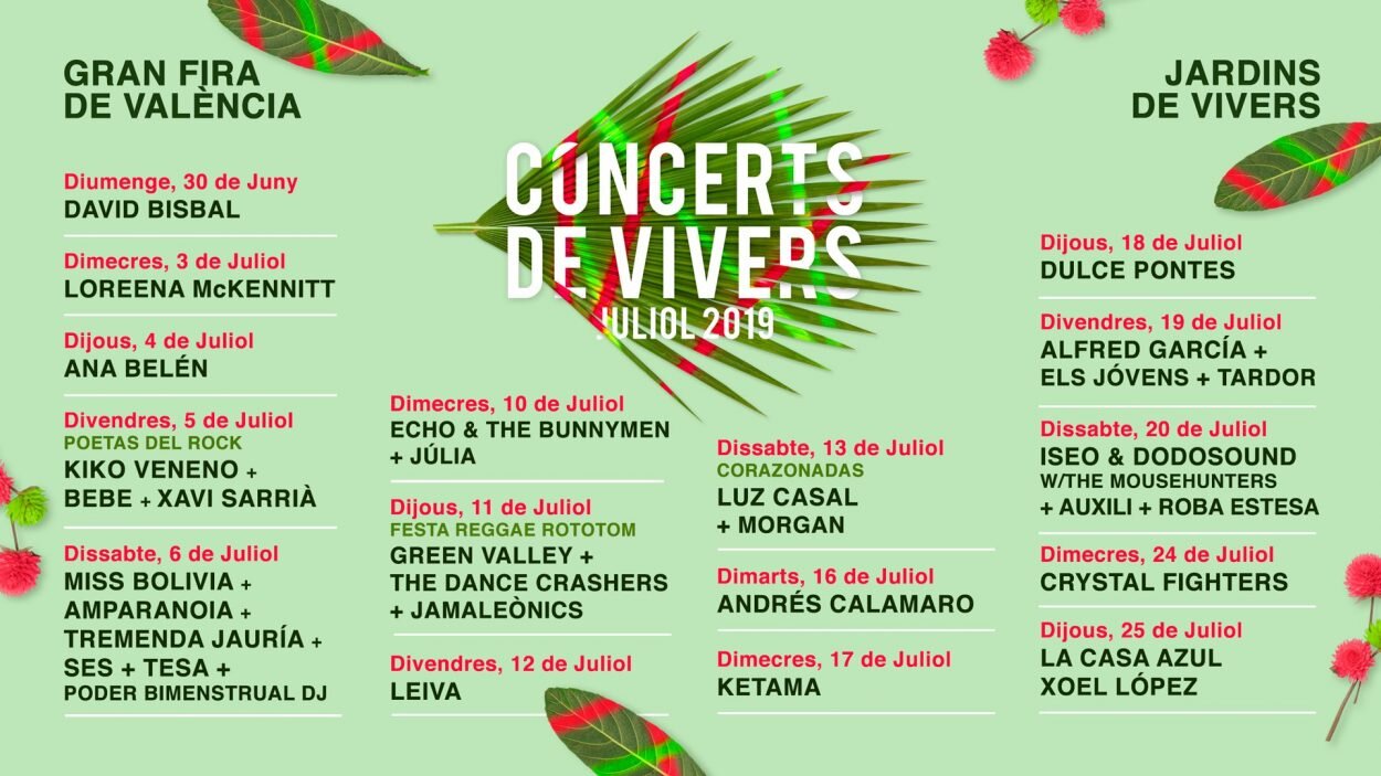 Los Conciertos de Viveros de la Gran Fira de València arrancarán el próximo domingo, 30 de junio, con la actuación del cantante David Bisbal que presentará su nuevo directo. El cartel de este ciclo de espectáculos incluye figuras como Luis Fonsi, Dulce Pontes, Andrés Calamaro, Leiva, Luz Casal, Aitana, Xavi Sarrià, Tesa y Els Jóvens. En definitiva, «combinará artistas internacionales, estatales y valencianos de varios estilos para llegar a todos los gustos», tal como ha resaltado el concejal Pere Fuset, quien también ha destacado «la alta participación femenina en estos conciertos, puesto que más del 50% de las bandas o solistas son mujeres o cuentan con alguna integrante femenina (20 de 36)».