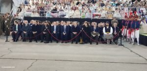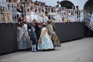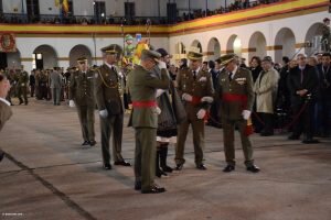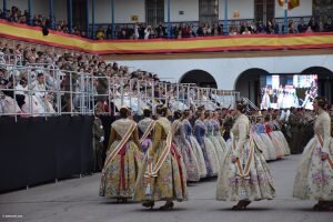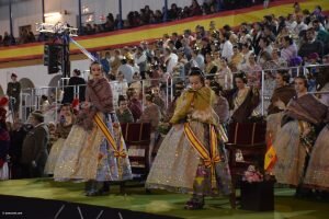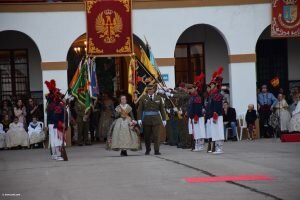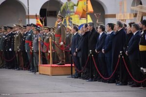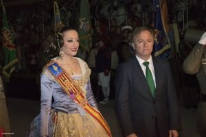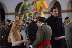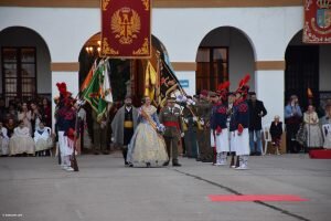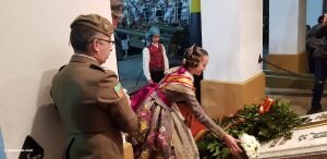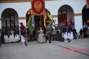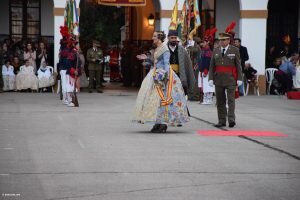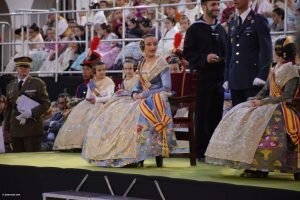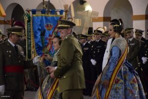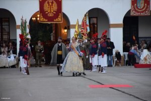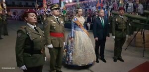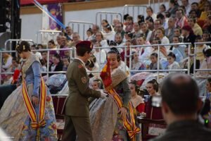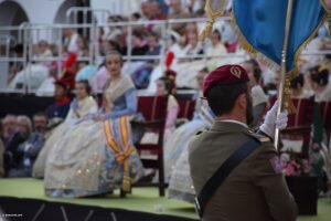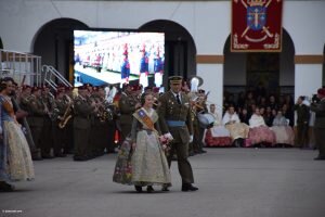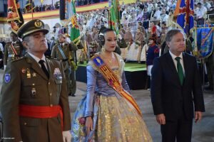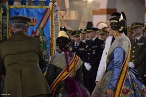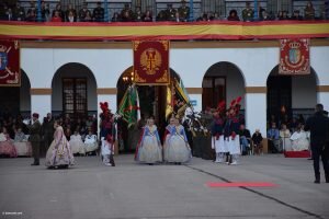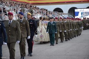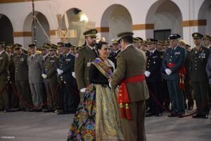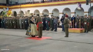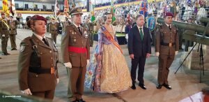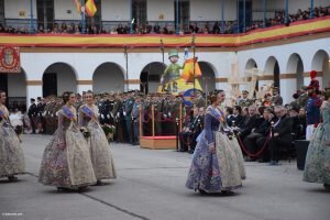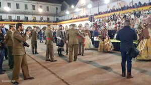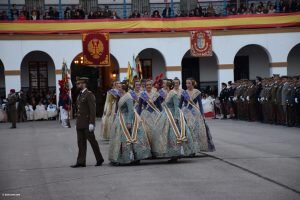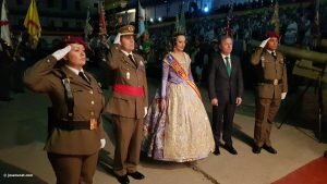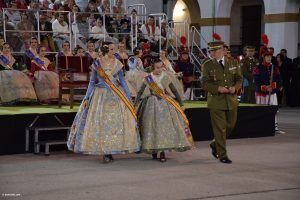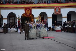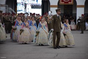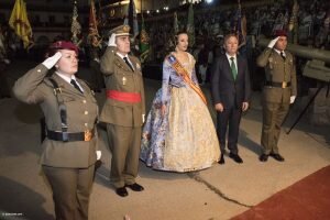 Una vez recibidas en el patio del acuartelamiento la Fallera Mayor y Fallera Mayor Infantil con sus Cortes de Honor, ha dado comienzo el acto militar, al que han asistido diferentes autoridades civiles y militares, entre las que se encontraba el Delegado del Gobierno en la Comunidad Valenciana, Juan Carlos Moragues, el Director General de Emergencias de la Generalitat Valenciana Jose María Angel, y el Concejal de Fiestas del Ayuntamiento de Valencia y Presidente de la Junta Central Fallera, Pere Fuset.